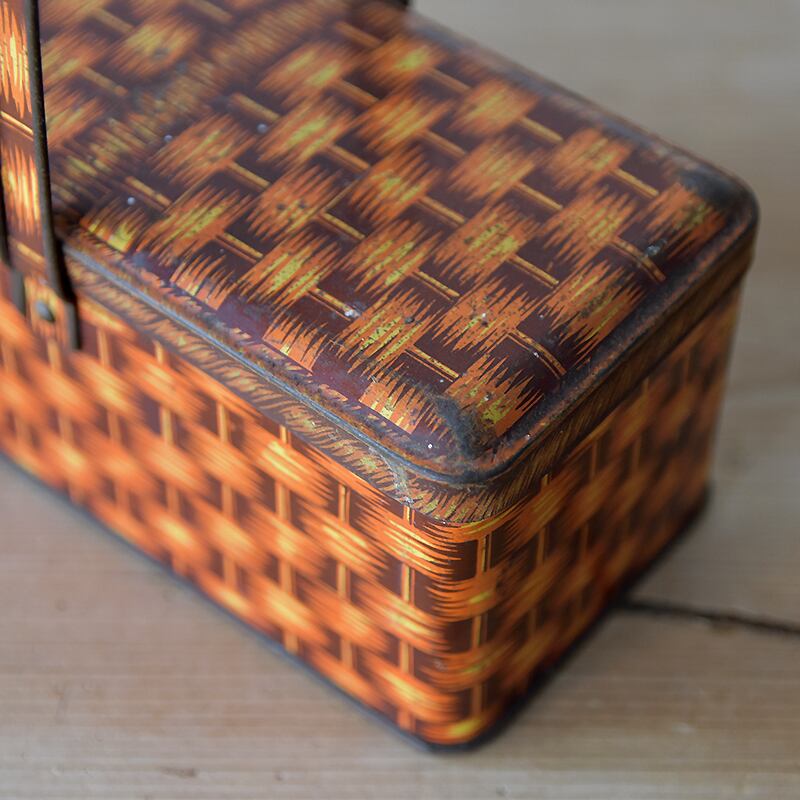 ウィローピクニックバスケット柄のハンドル付きティンボックスです。