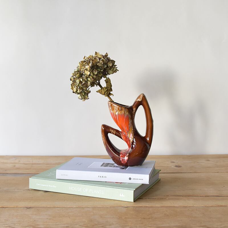 流れる釉薬で描かれた独特の模様が魅力のフラワーベースです。