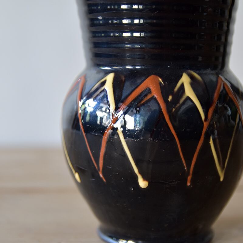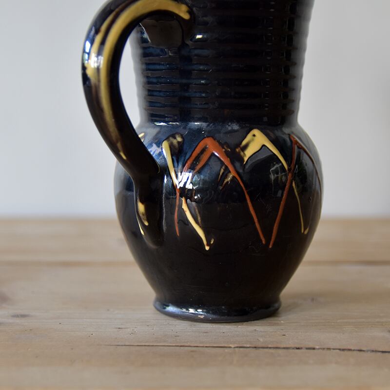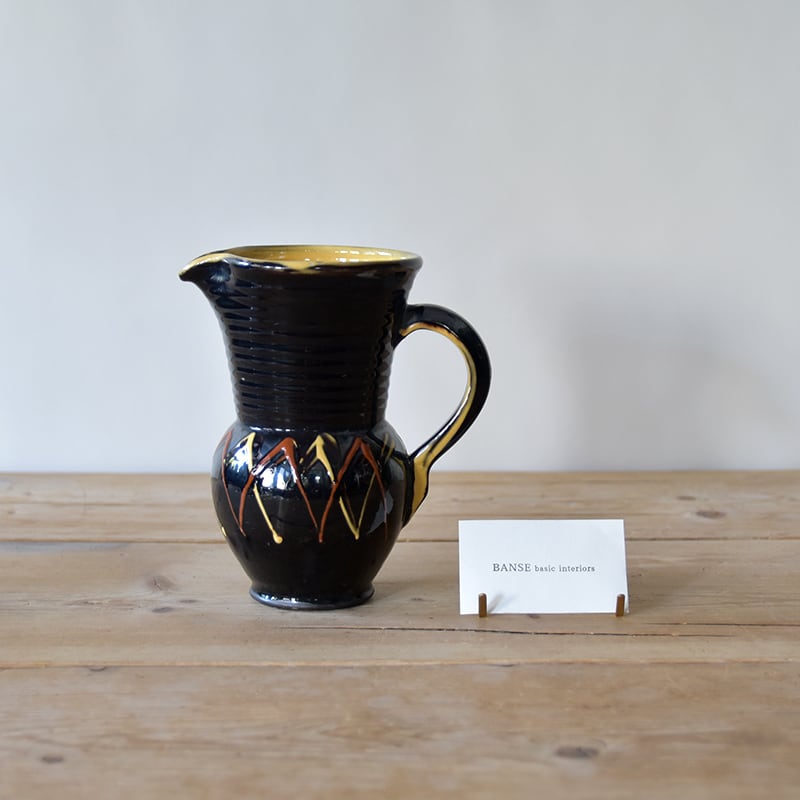 黒く光沢のあるボディに凹凸を付けて描かれた幾何学模様が特徴的なフランス製の水差しです。