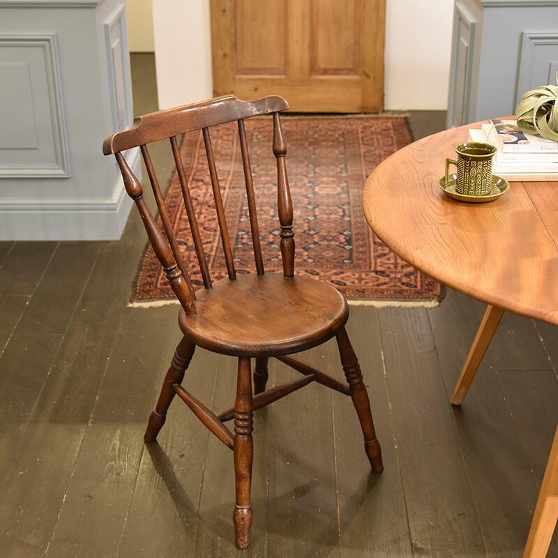 イギリス伝統のアイベックスチェアに近いデザインの丸い座面が特徴的な一脚です。