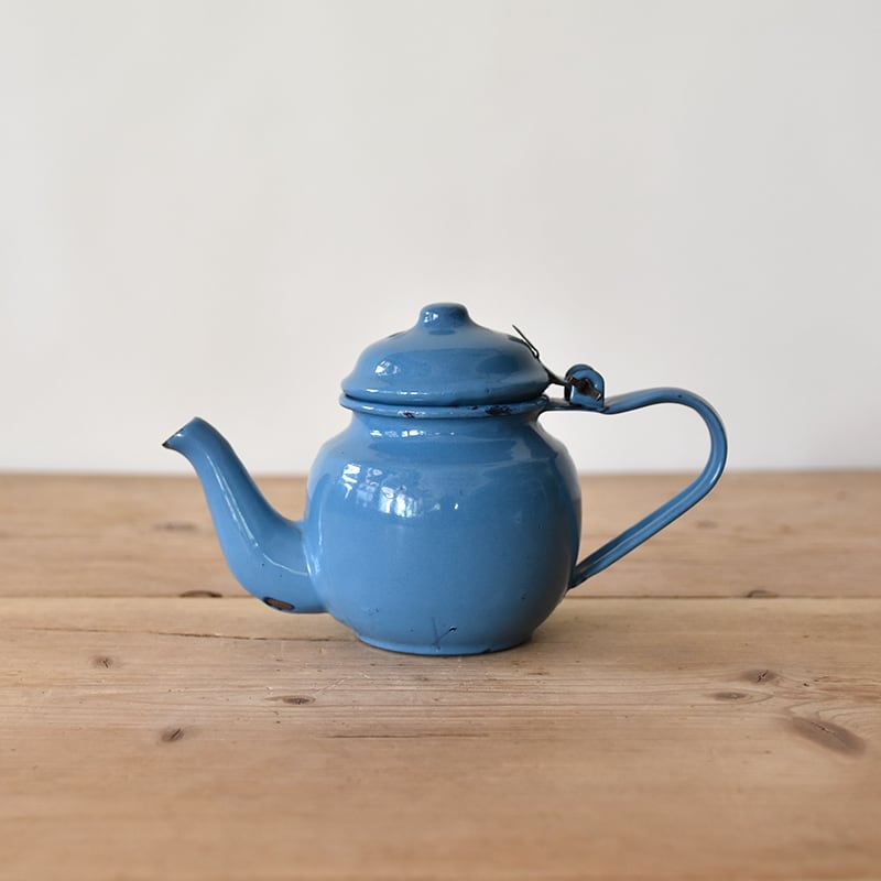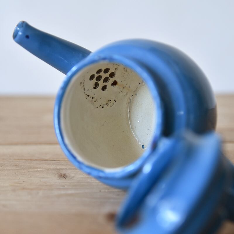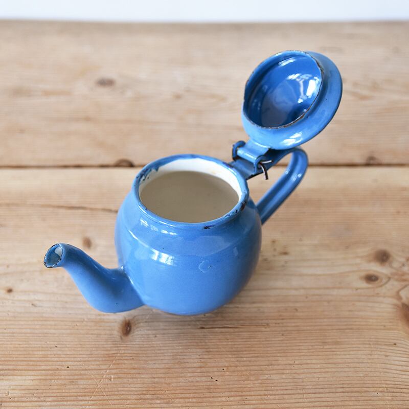 鮮やかなブルーと経年のホーローの味わいが絶妙な小さなポットです。