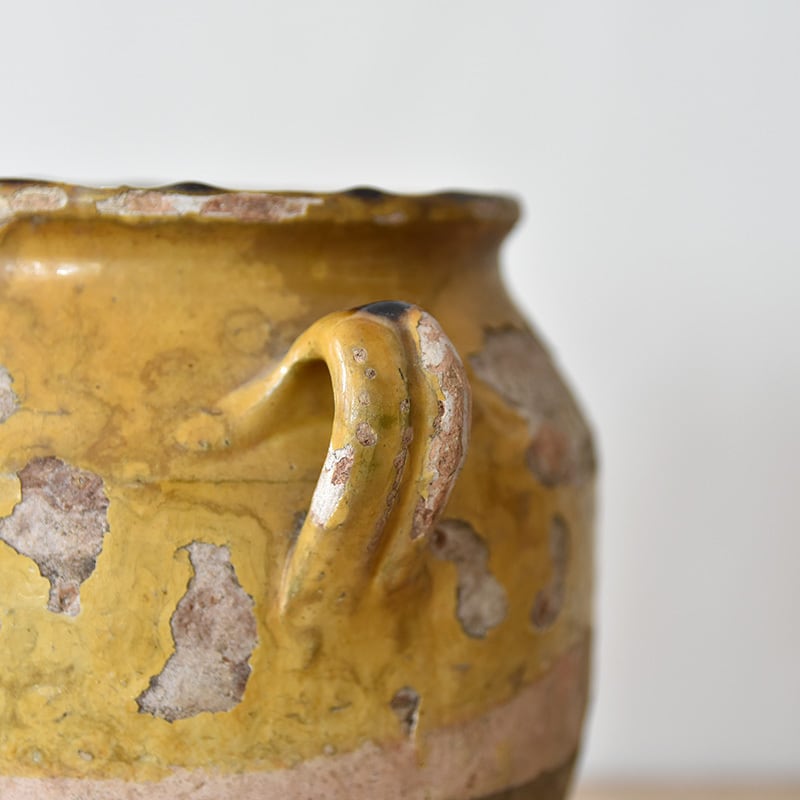 フランスらしい鮮やかな黄色の釉薬が剥がれ落ちた質感は、まさにフランスアンティークらしいシャビーシックな佇まいです。