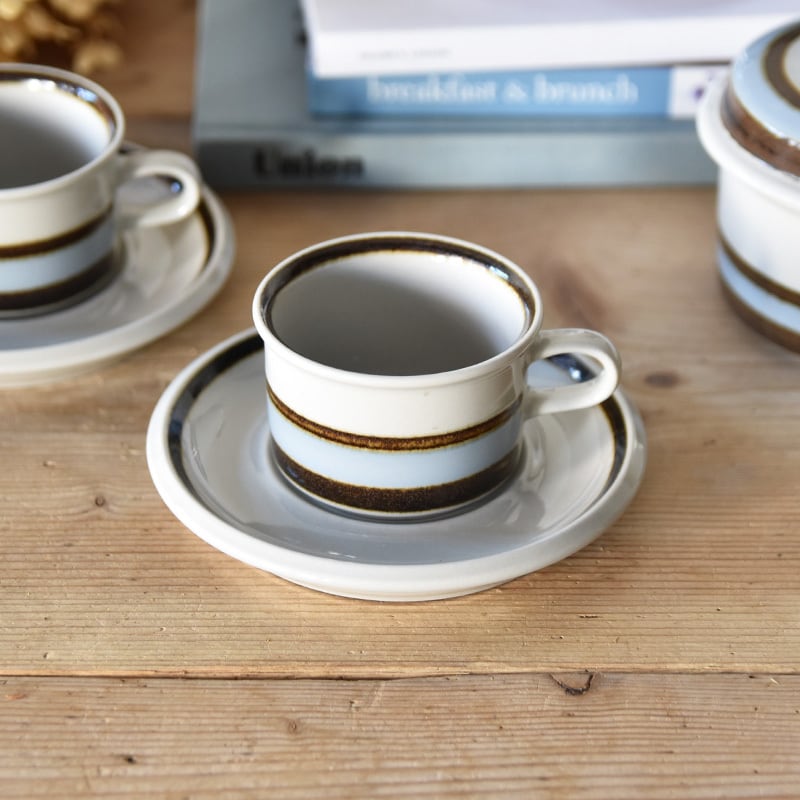 艶やかな白い器とブラウンとブルーのラインのコントラストが美しいアラビア Suvanto(スヴァント)のデミタスカップ&ソーサーです。