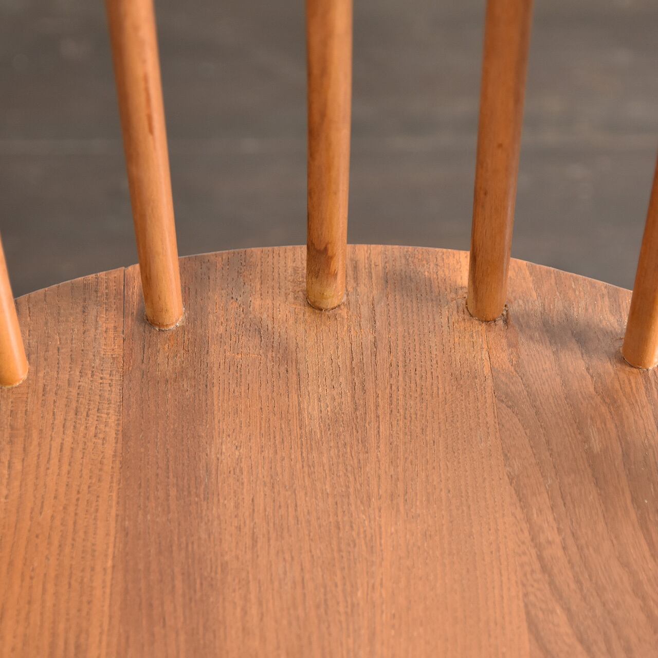 優しく丸みを帯びたエルム材の座面に、すっきりと長く伸びた脚。