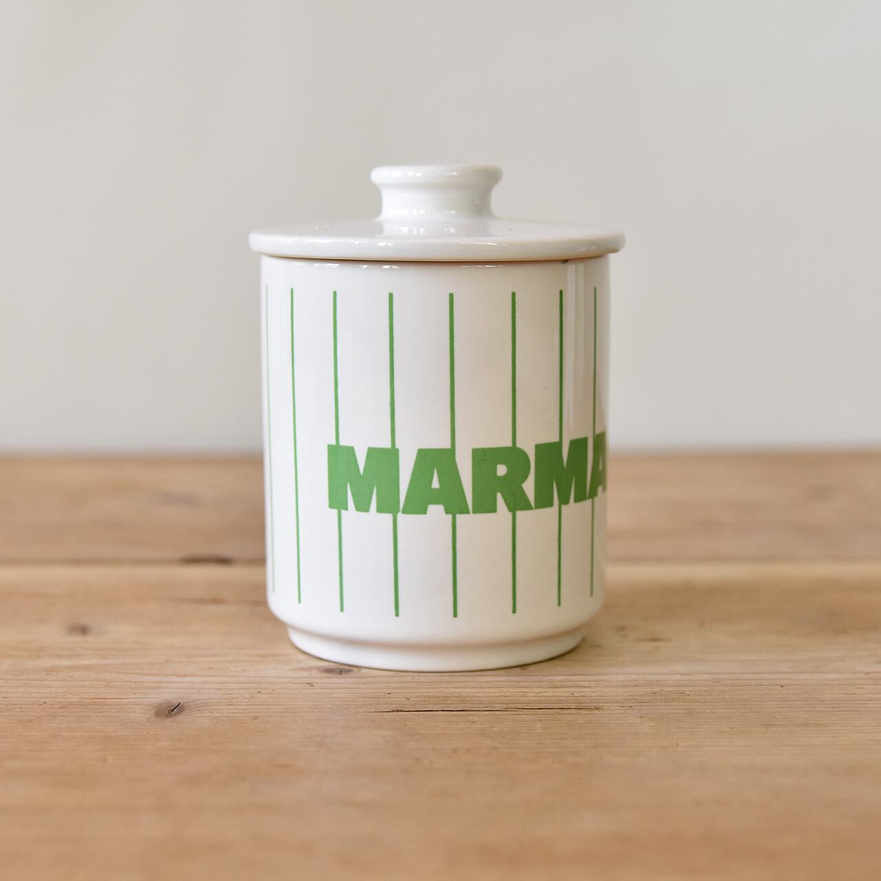 ハンドペイントのストライプとポップなテキストが印象的なホーンジーのヴィンテージジャムポットです。