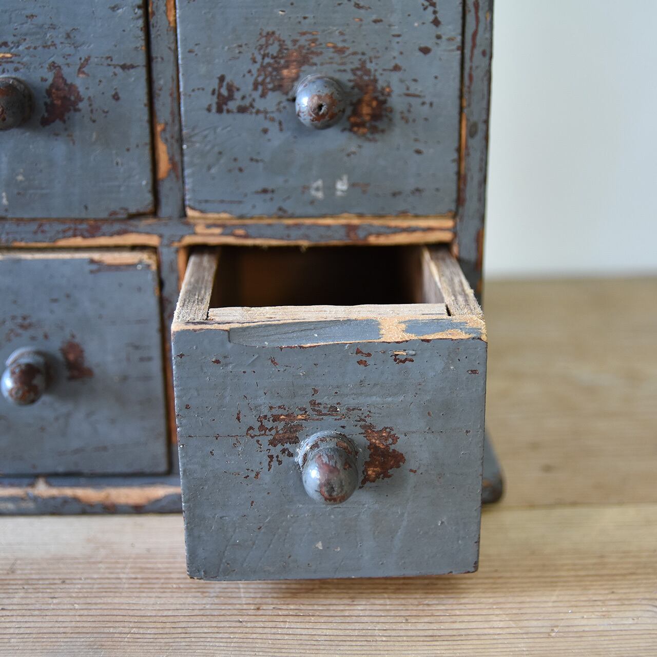 小さな引き出しが集まった卓上サイズのスプール(=糸巻き)用のキャビネットです。