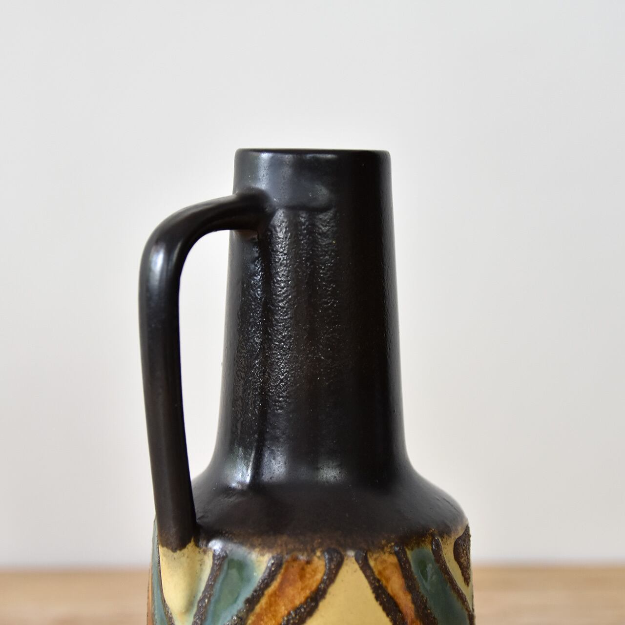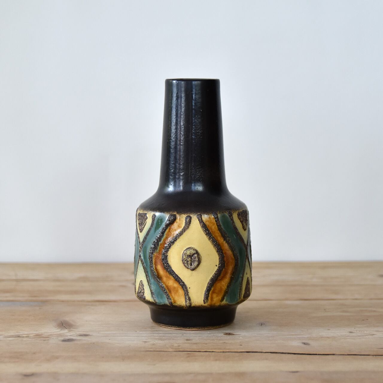 黒いボディにプリミティブな幾何学模様がデザインされた、東ドイツ シュトレーラのポタリーベース。